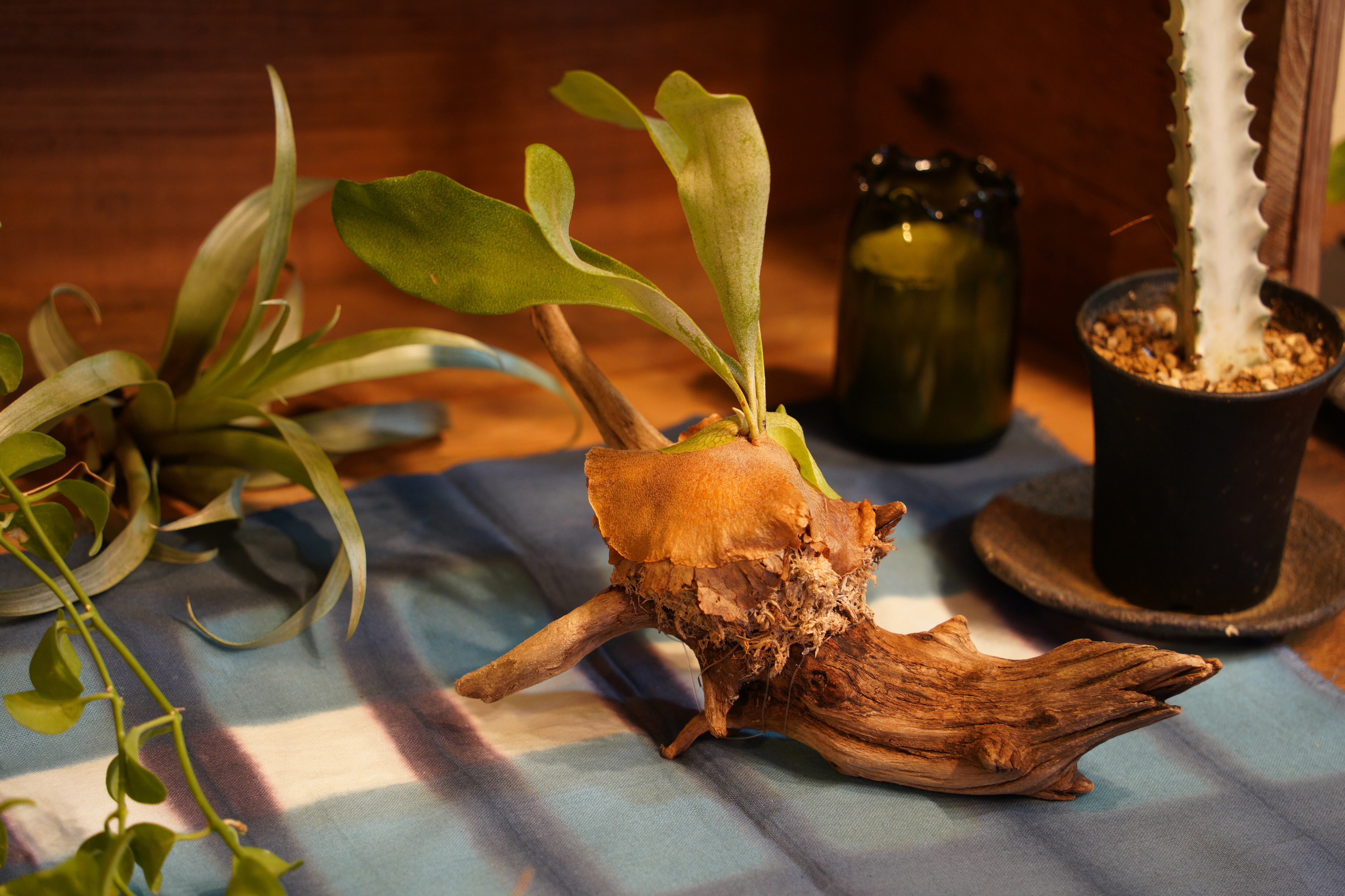 流木で小さく仕立てています。初めてのビカクシダに最適な育てやすい品種です。